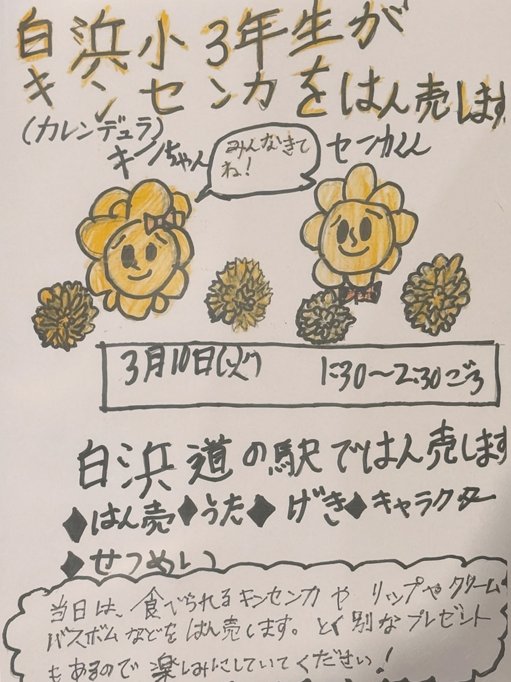 2026年3月10日(火)の13:30より、道の駅白浜野島崎にて、白浜小学校の3年生が育てたキンセンカなどの販売会を行います。